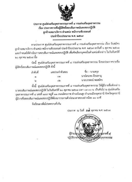 ประกาศรายชื่อผู้มีสิทธิ์สอบสัมภาษณ์และสอบปฏิบัติลูกจ้างเหมาบริการ ตำแหน่ง พนักงานขับรถยนต์ ประจำปีงบประมาณ พ.ศ. 2569