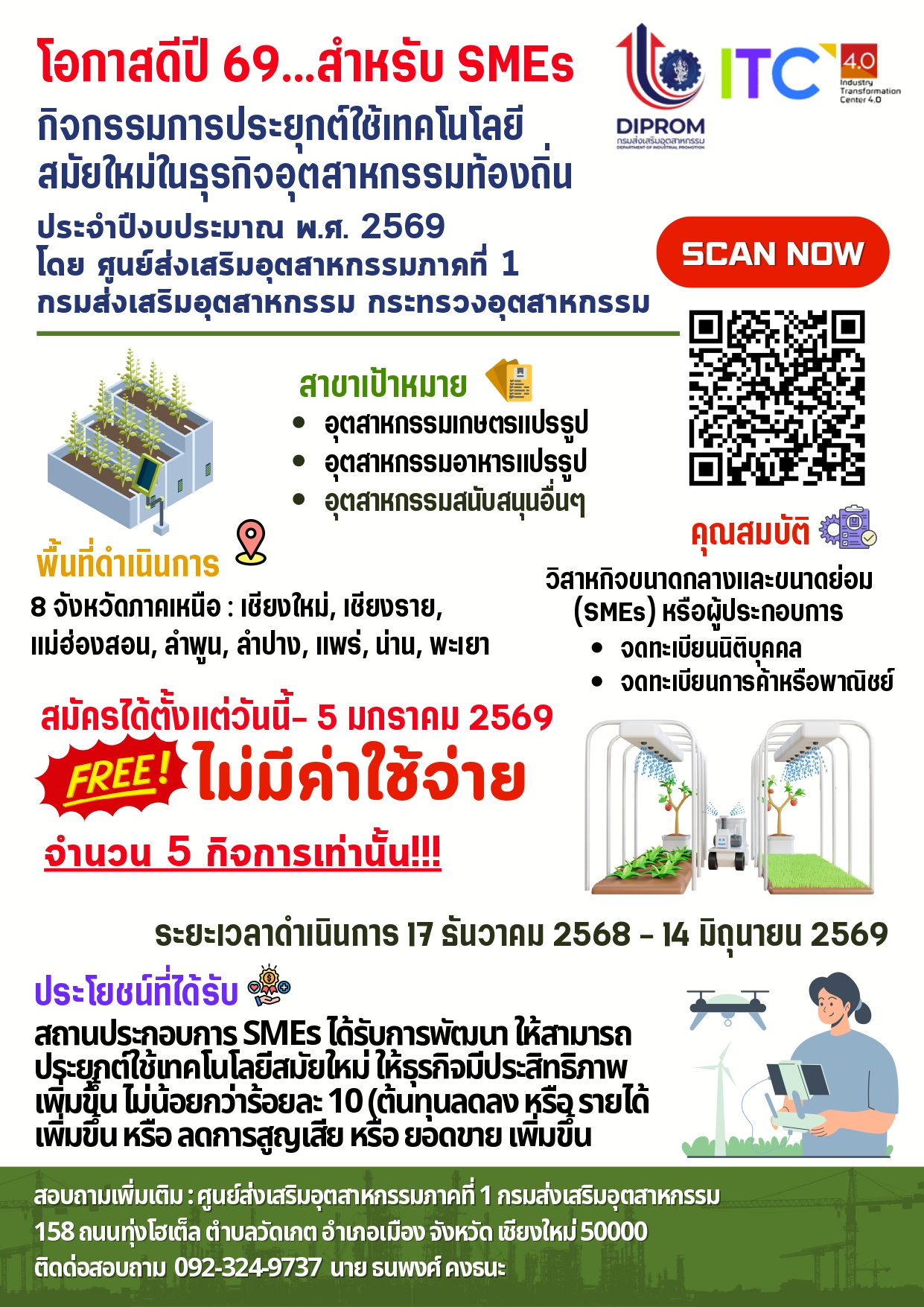 โอกาสดีปี 69 สำหรับ SMEs ขอเชิญสมัครเข้าร่วมกิจกรรมการประยุกต์ใช้เทคโนโลยีสมัยใหม่ในธุรกิจอุตสาหกรรมท้องถิ่น ประจำปีงบประมาณ พ.ศ. 2569 โดย ศูนย์ส่งเสริมอุตสาหกรรมภาคที่ 1 กรมส่งเสริมอุตสาหกรรม กระทรวงอุตสาหกรรม
