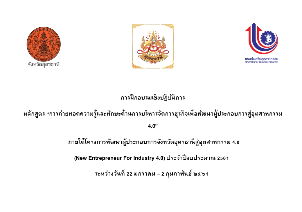 ขอเรียนเชิญเข้าร่วมฝึกอบรมเชิงปฏิบัติการ หลักสูตร “การถ่ายทอดความรู้และทักษะด้านการบริหารจัดการธุรกิจเพื่อพัฒนาผู้ประกอบการสู่อุตสาหกรรม 4.0” และการนำเสนอแบบจำลองธุรกิจ (Business Model Canvas : BMC) ระหว่างวันที่ 22-25 มกราคม 2561 และ 28 มกราคม – 2 กุมภาพันธ์ 2561 ด้วยศูนย์ส่งเสริมอุตสาหกรรมภาคที่ ๔ กรมส่งเสริมอุตสาหกรรม กำหนดจัดฝึกอบรมเชิงปฏิบัติการ หลักสูตร “การถ่ายทอดความรู้และทักษะด้านการบริหารจัดการธุรกิจเพื่อพัฒนาผู้ประกอบการสู่อุตสาหกรรม 4.0” และการนำเสนอแบบจำลองธุรกิจ (Business Model Canvas : BMC) ระหว่างวันที่ 22-25 มกราคม 2561 และ 28 มกราคม – 2 กุมภาพันธ์ 2561 เวลา ๐๘.๐๐ – 21.0๐ น. ณ ห้องเชียงงาม โรงแรมบ้านเชียง อำเภอเมือง จังหวัดอุดรธานี